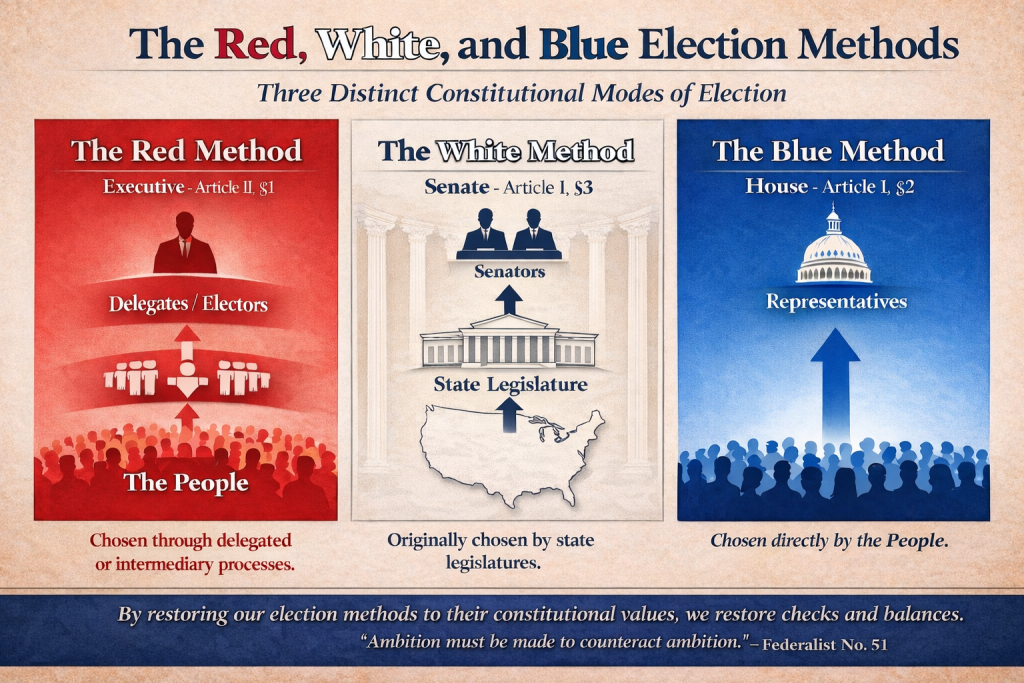 Article 2, Section 1 specifies indirect or delegated elections like the caucus and convention for executive branch officers, and Article 1 Section 3 specifies legislative elections for the Senate, and Article 1, Section 2 specifies direct popular vote elections for House Representatives. I call these the red, white, and blue election methods of our American Republic. The same principles can be applied at the state level almost trivially.